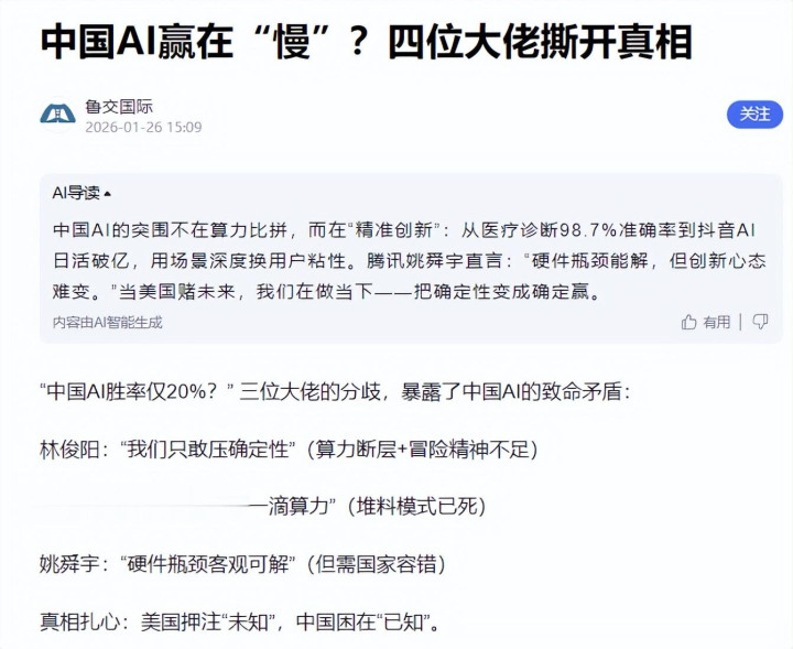 哈喽,大家好,小林哥这篇文章分析中美AI竞赛的话题被业内热议时,国内几位AI领军者给出过一个共识性判断,姚舜宇、林俊阳、唐杰等人,结合当下算力储备和研究现状,认为中国在这场竞争中获胜的概率大概是20%。